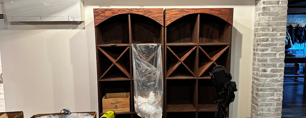 Their basement had a lot of furniture down there—a giant coffee table, two heavy, vintage tables and massive tv hutch were left behind from the previous owner, who also happened to be a well known chef and restaurateur so they had a quasi-wine cellar in the basement, with so. many. wine shelves. SO MANY. There was also a heavy free standing bar and bar stools and a lot of exercise equipment that is used everyday, so we needed to carve out a zone that was accessible but also felt normal and right among the furniture, tv and bar etc... The wine shelves seemed like they would be a cool feature, but it was a bit like Tetris figuring out how to break them up and organize the space so it made sense for the family—because at the end of the day what they really need is a livable, functional space that works for them—and these shelves were not working.